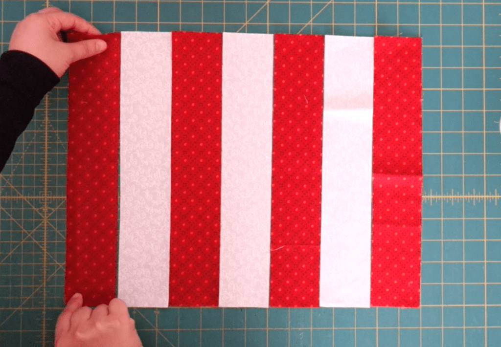 بعد القص، رتبت الرقع كما في الباترون أعلاه. خيطت كل شريط أحمر مع شريط أبيض ( عرض الدرز ربع إنش دائماً ). أثناء الخياطة إحرصي على عدم شد القماش بتاتاً.