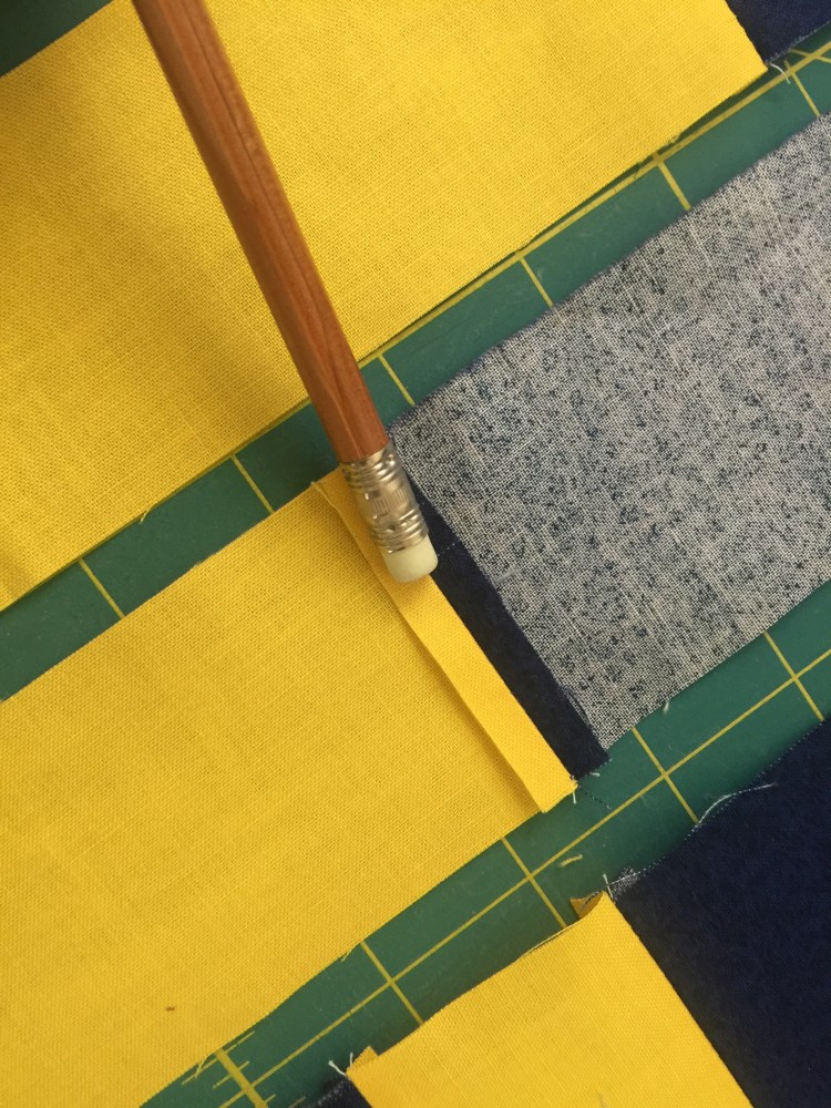 لنبدأ بالكي. في لحاف مقلم، قمنا بكي حواشي الرقع للقماش الغامق ( الأحمر ). هذه هي الطريقة المتبعة غالباً في صناعة اللحف و الترقيع. باللغة الإنجليزية يقولون : Press to the dark side.