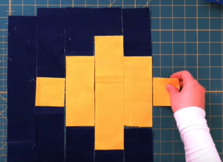 الآن نرتب الرقع كما في الباترون أعلاه. نخيط الرقع مع بعضها. صفاً تلو الآخر، من الأعلى إلى الأسفل.